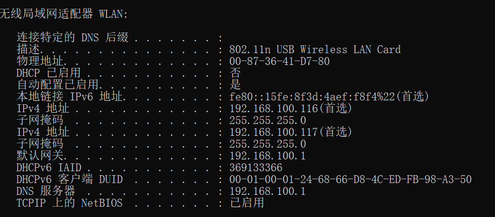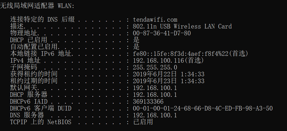 由于我本机没有物理网卡,使用的是一个无线usb连接的家里的无线网,所以我本机的网卡就是下图中的无线局域网适配器,接下来我们给网卡添加一个额外的ip地址,首先看一下本机的ip配置信息,命令行输入ipconfig/all,