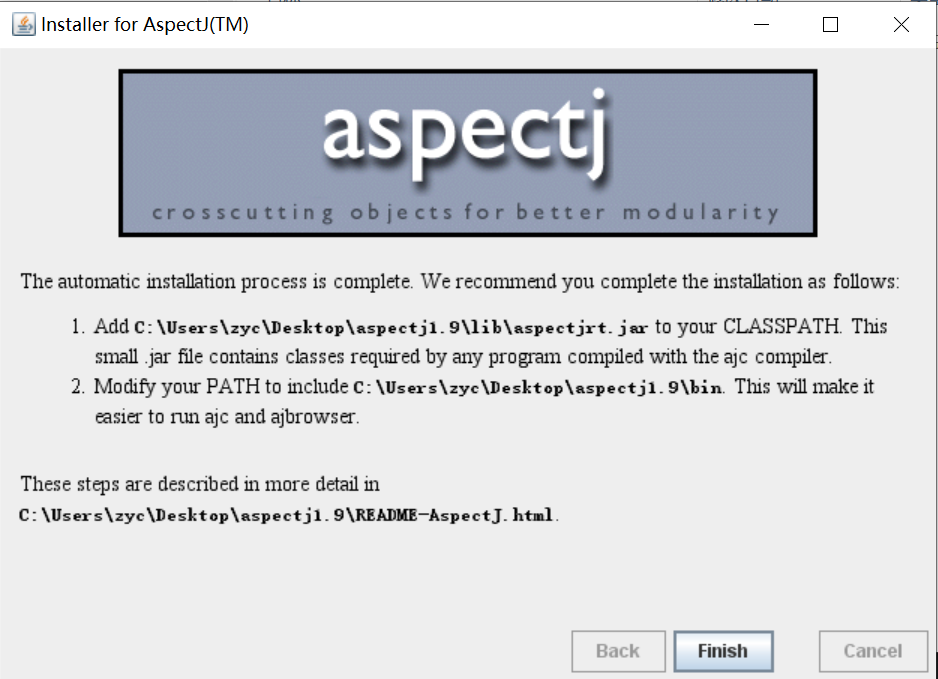 根据官方推荐的教程,首先我们需要在AspectJ下载这个页面中下载最新的jar包,下载到本地之后,使用java -jar命令运行该jar包,接着会弹出一个安装界面,一路next就行,安装成功后的页面如下: