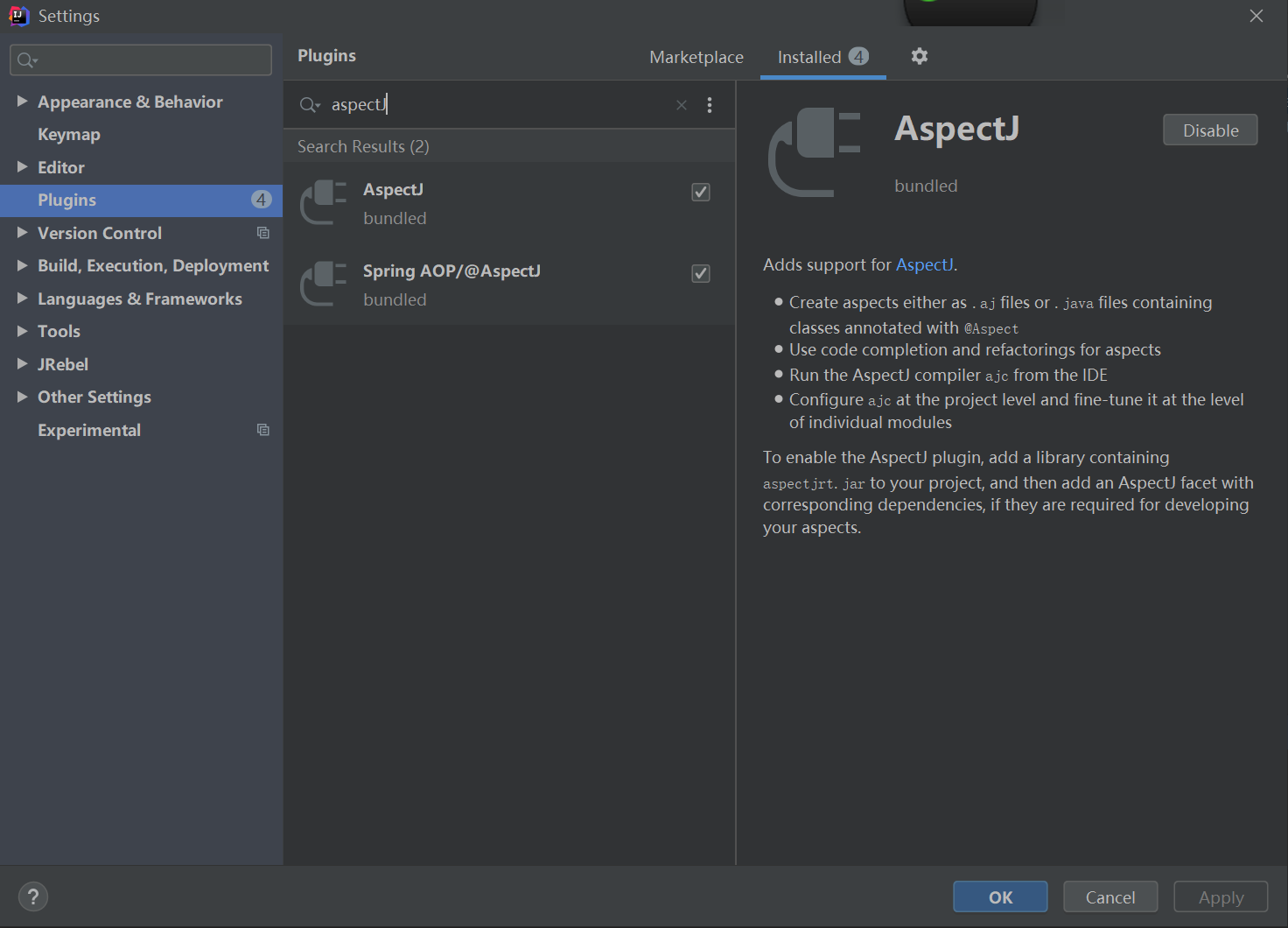 上图中有两个建议,第一个是将安装完成后解压的目录中aspectjrt.jar包添加到你工程的类路径下,第二个建议是将加压目录下的bin路径添加到你环境变量的path中。以便手动调用ajc编译器编译java代码。由于我使用的是idea,首先第一步检查idea是否已安装aspectJ语法支持插件