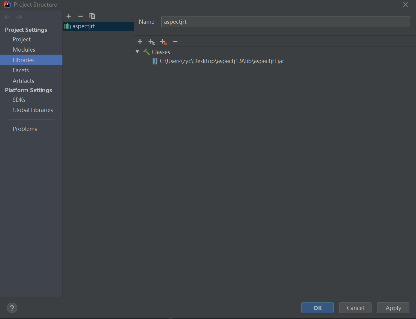 第二步将AspectJ安装后解压目录下的aspectjrt.jar添加到工程库中(快捷键ctrl+shift+alt+s)