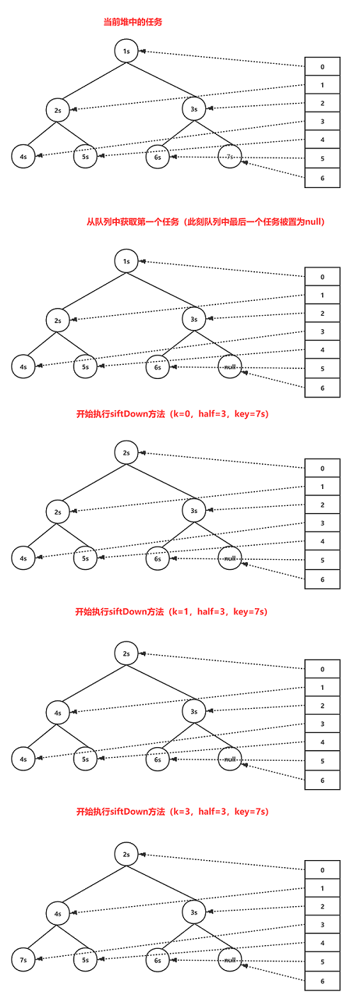 siftDown方法的作用是从索引k位置开始往下最多递归能够拥有子节点的次数,只要找到索引k下的最小的那个子节点值比key还要大,说明key节点是能够成为索引k的子节点的,否则的话将索引k赋值为值最小的那个子节点,然后继续从该最小子节点的索引处往下递归直到将key放在合适的位置位置,整个过程中key节点呈现的是下降趋势。整个siftDown方法的执行流程可以通过下图来表示: