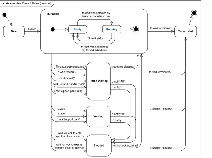 start()方法后,线程的状态就是RUNNABLE,该状态指示表示线程可以运行,不表示线程当前一定在运行,线程是否运行由虚拟机所在操作系统调度决定。BLOCKED:当线程尝试调用某个对象的